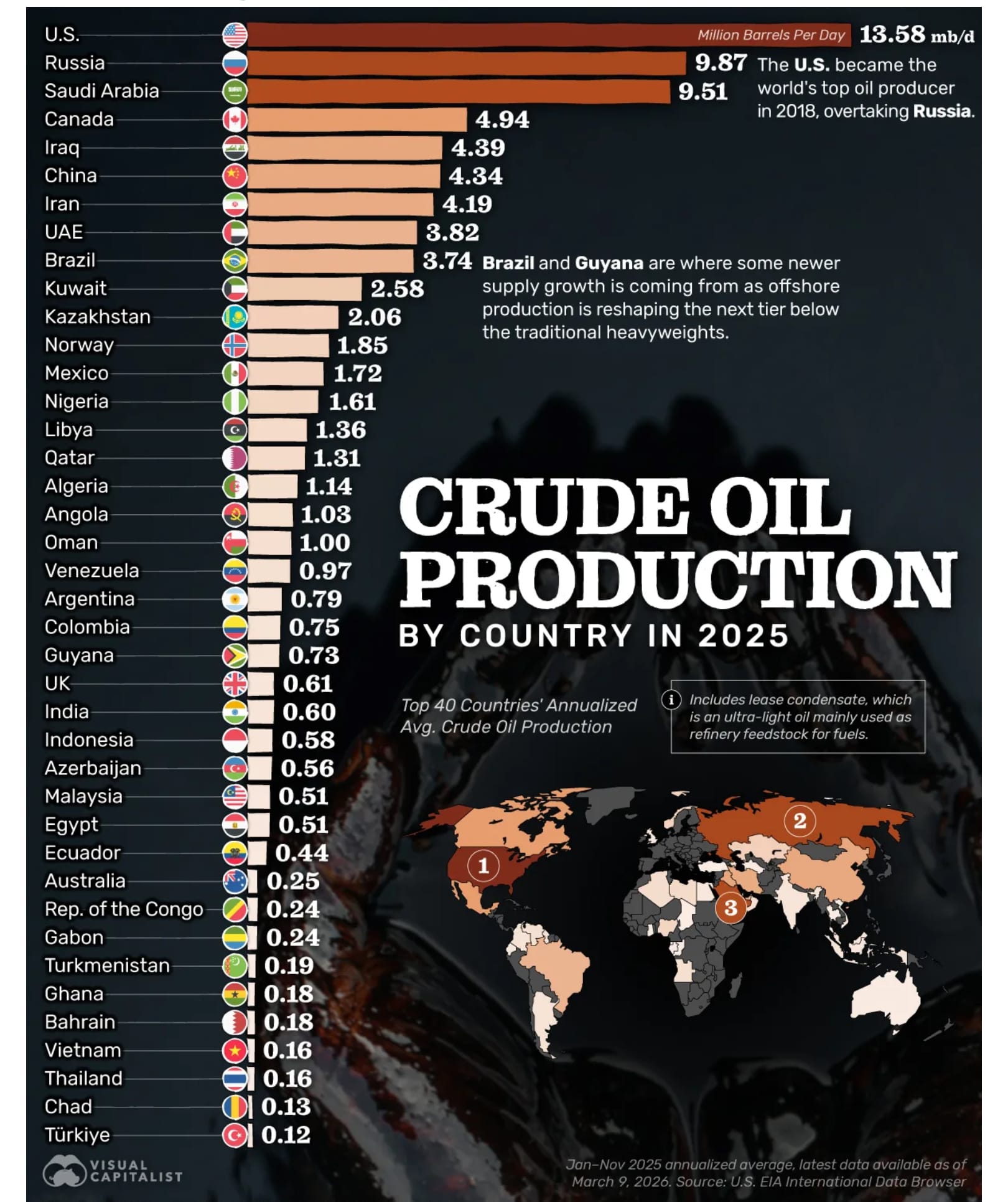 The result? By 2025 and 2026, U.S. production skyrocketed to a record-breaking ~13.6 million barrels per day. The United States is now the undisputed number one crude oil producer in the world, pumping out significantly more oil than both Saudi Arabia and Russia.