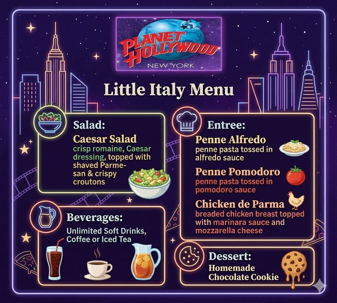 We are heading to Planet Hollywood in Times Square for lunch. The menu is linked below, and yes, there is a vegetarian option available. It’s Times Square, so expect it to be loud, crowded, and completely chaotic. And don't touch dirty Elmo.